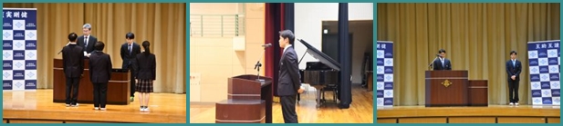 生徒会役員認証式_先日の生徒会役員選挙投票結果により全員が信任され、新生徒会長、新副会長2名が決まりました。新旧生徒会長から退任、着任のあいさつが行われました。3年次生徒会のみなさん、これまでの生徒会活動お疲れ様でした。