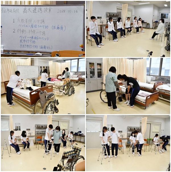 山梨県立身延高等学校 > 教育活動 > 高大連携授業<福祉分野> 2025年11月4日カテゴリー: 教育活動 高大連携授業<福祉分野> <キャリア事業>家庭科_3年次選択授業「生活と福祉」では、身延山大学と連携授業を行っています。 10月9日は本校にて介護についての講義を受講しました。 10月16日には、介助・介護実習を身延山大学の実習棟において、衣服着脱、移動・移乗などについて学びました。身体の左半身が麻痺している人の介護を想定して、介護される側とする側でロールプレイ方式で実習を行いました。