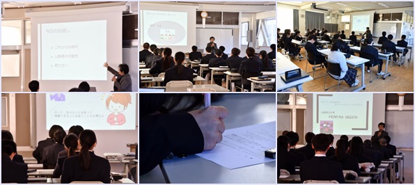 1月7日 ⑥校時 1年次生は、理系進路選択支援プログラムとして訪問講義を受講しました。これからの時代、山梨県の可能性、君たちへという内容で進められ、自分たちの置かれている現状や将来のこと、環境についても詳しく知ることができ、進路を考えていく上でとても有意義な時間となりました。
