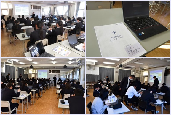 1月14日 6校時 1年次生は外部講師による分野別講演会を受講しました。文系・理系・専門の学問分野の説明を受け、希望する分野や興味のある分野について、各自のPCでワークブックを使った調べ学習を行いました。