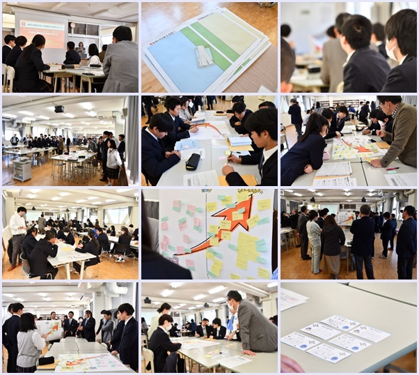2月6日 1年次生は総合的な学習の時間に、中小企業同友会との協働コミュニティ・ワークを行いました。先ずはアイスブレイクで自分の意志でどちらかを選択するということを行ったり、自己紹介や自分たちなりのミライ地図を完成させたり、名刺交換の仕方を教わるなど、充実した時間になりました。