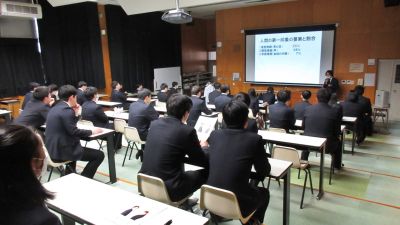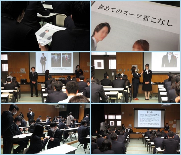 2月10日は3年次生登校日。卒業後、正式な場所へ行く際はスーツや礼服を着る機会が増えることを踏まえ、業者の方からスーツの着こなし方を教わりました。スーツの色・柄だけでなく、小物類を選ぶポイントや名刺交換の仕方も学びました。
