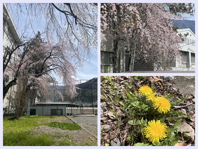 身延町といえば…桜🌸を思い浮かべることと思います。身延高校においても一足早く開花する枝垂れ桜が綺麗に咲き始めました♪ 蒲公英も…