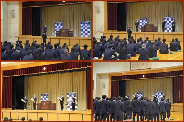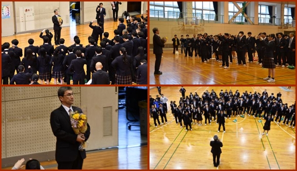 3月25日 今年度末で本校を離退任される先生方よりご挨拶いただき、生徒を代表して生徒会長がお礼と別れの言葉を述べました。3年間校長として勤務された丸山校長先生の退任にあたって、一旦退場後でしたが卒業生も加わり、全校生徒から感謝を込めて応援エールを贈る場面もありました。離退任される先生方、これまでありがとうございました。