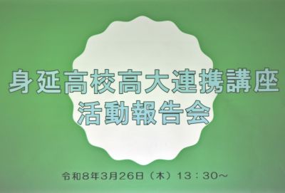 山梨県立身延高等学校 > 教育活動 > 高大連携事業 > 「高大連携事業」活動報告会 2026年3月27日カテゴリー: 高大連携事業 教育活動 部活動+plus 高大連携講座sky 「高大連携事業」活動報告会 高大連携講座SKY2025 3月26日 今年度の活動報告会が身延町役場にて行われました。昨年度からの活動を引き継ぎ、「身延町周辺の民話を観光に…」広めていくため、みのワンと民話のコラボを提案、しおりにして配布することにし、作製したものを町へお渡ししました。しおりからQRコードを読み込んでもらい、「note」を活用して民話をもっと知ってもらうことができると思います。発表終了後は町長室を見学させていただきました。